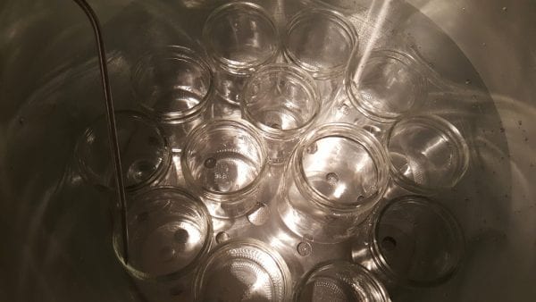 Put the jars in your canner on the metal plate. Add enough water to cover them by at least 2.5 cm (1 inch). I use a juice jug to fill the canner sitting on the stove.